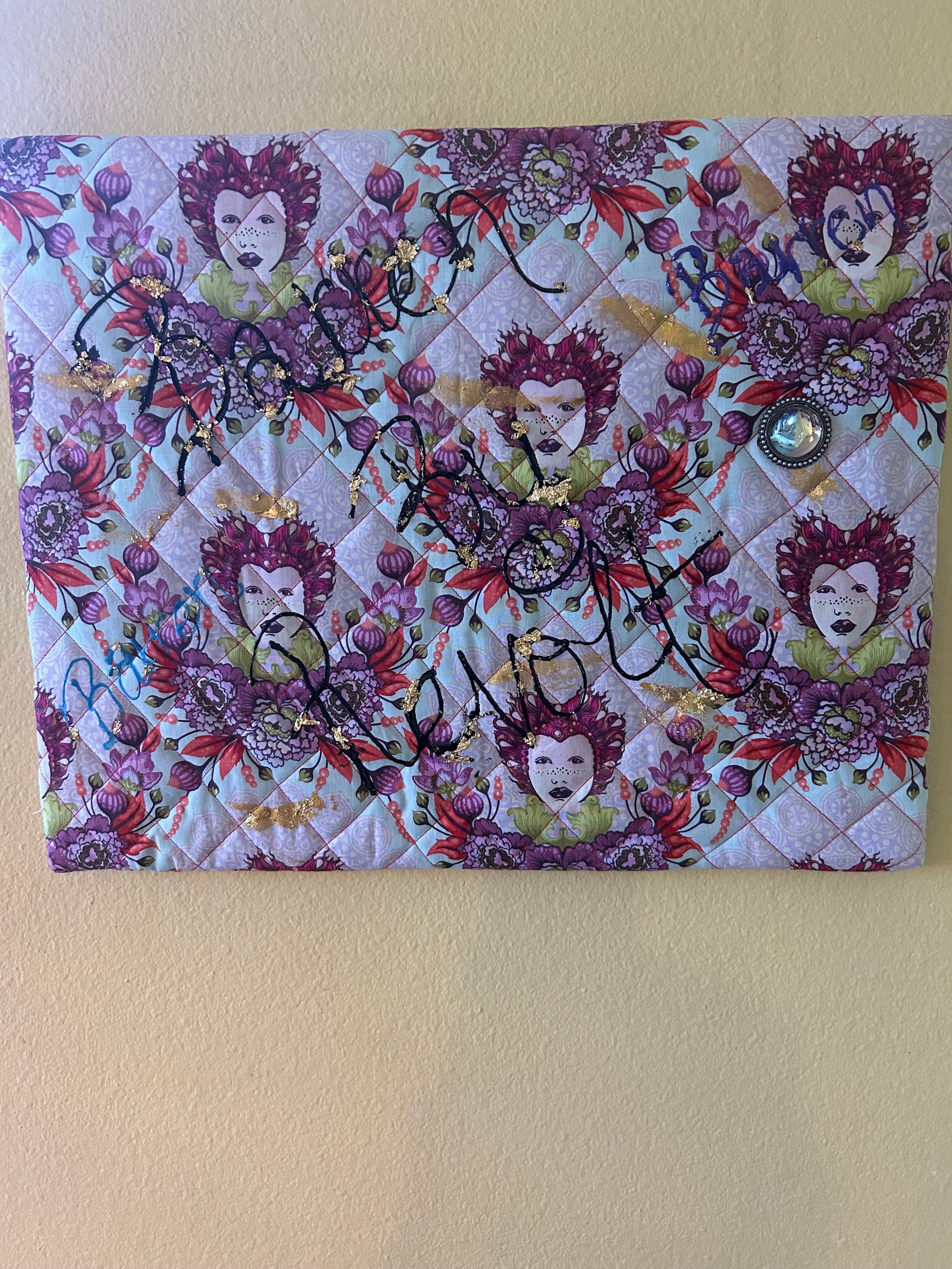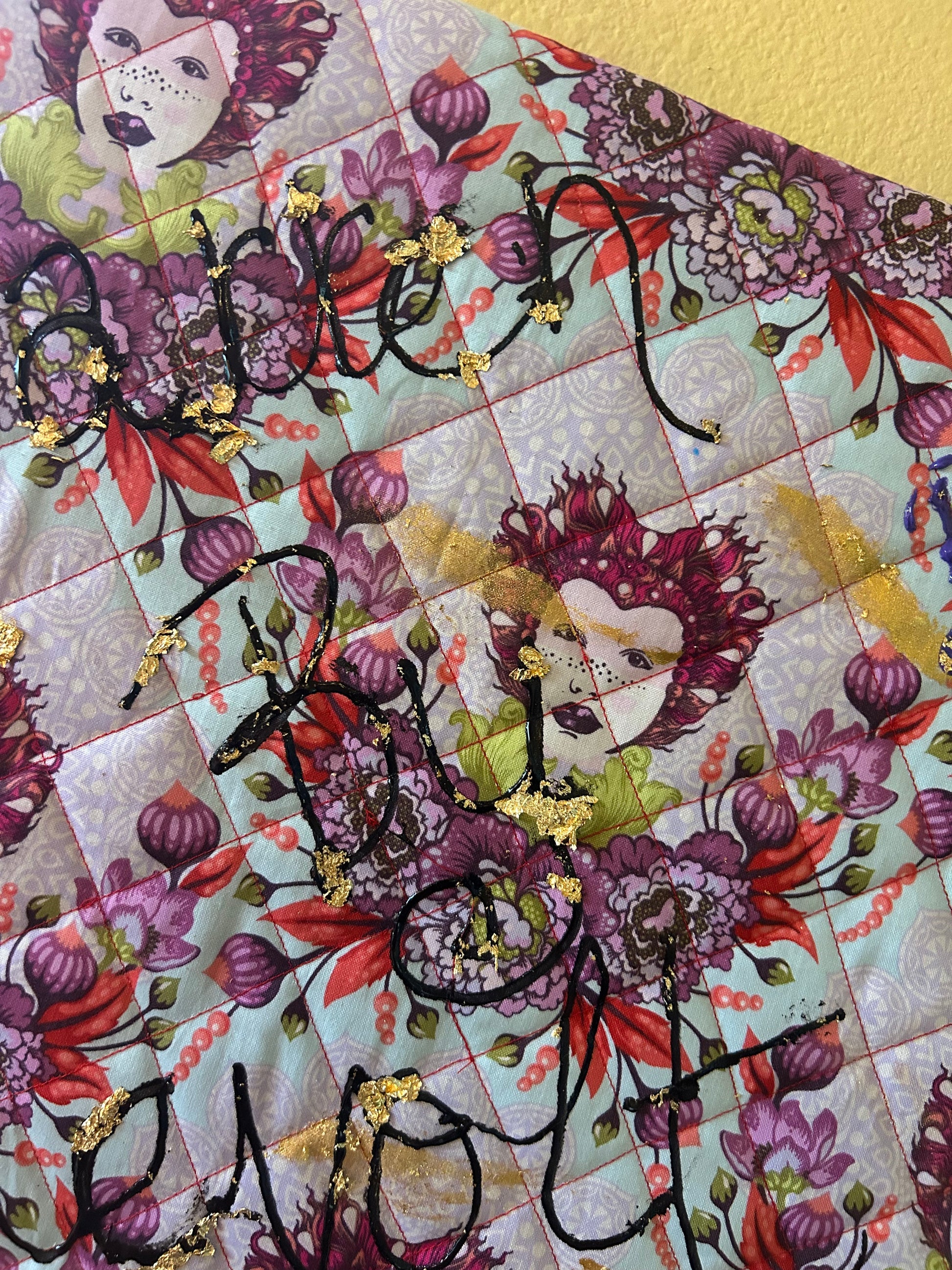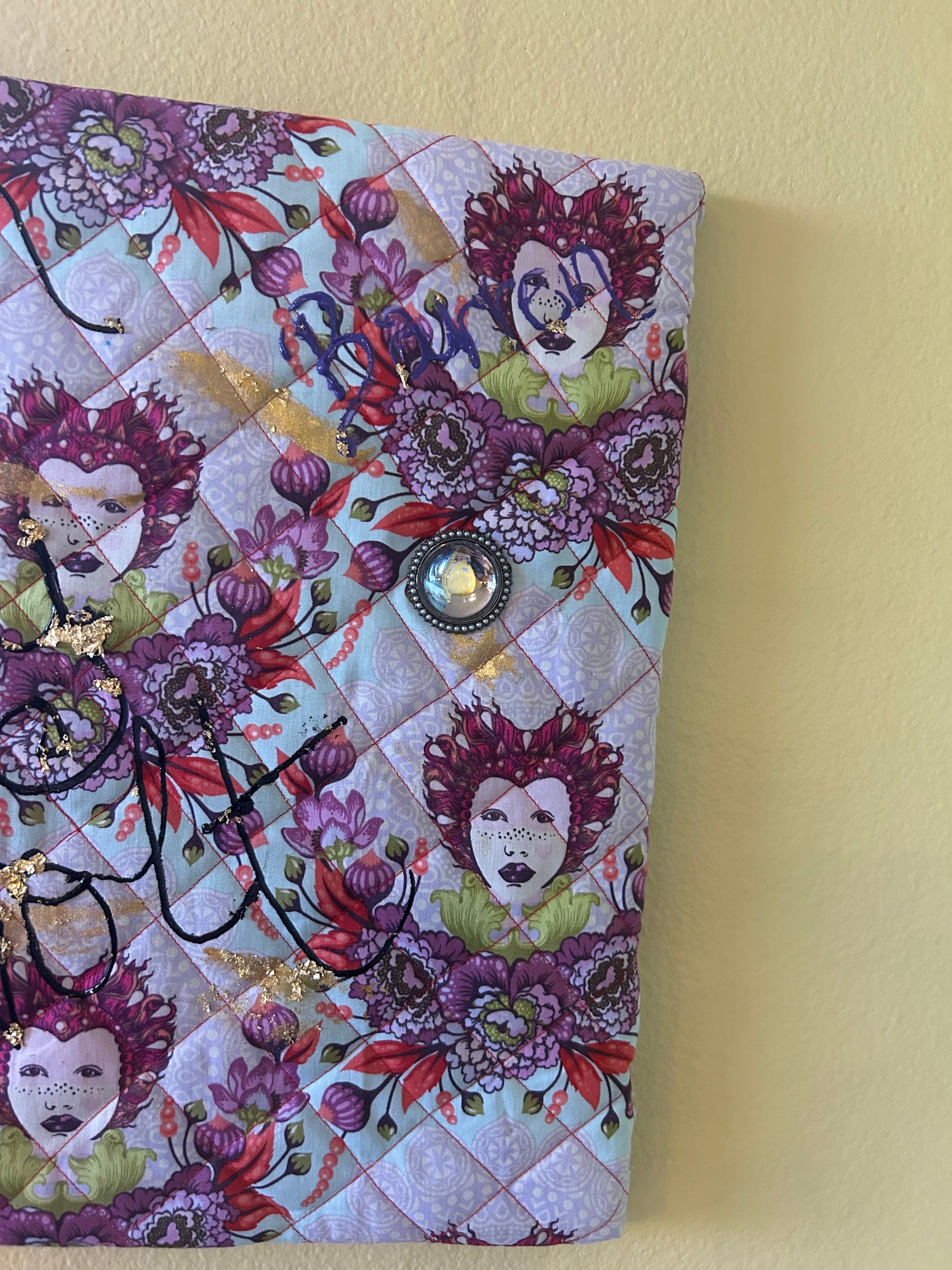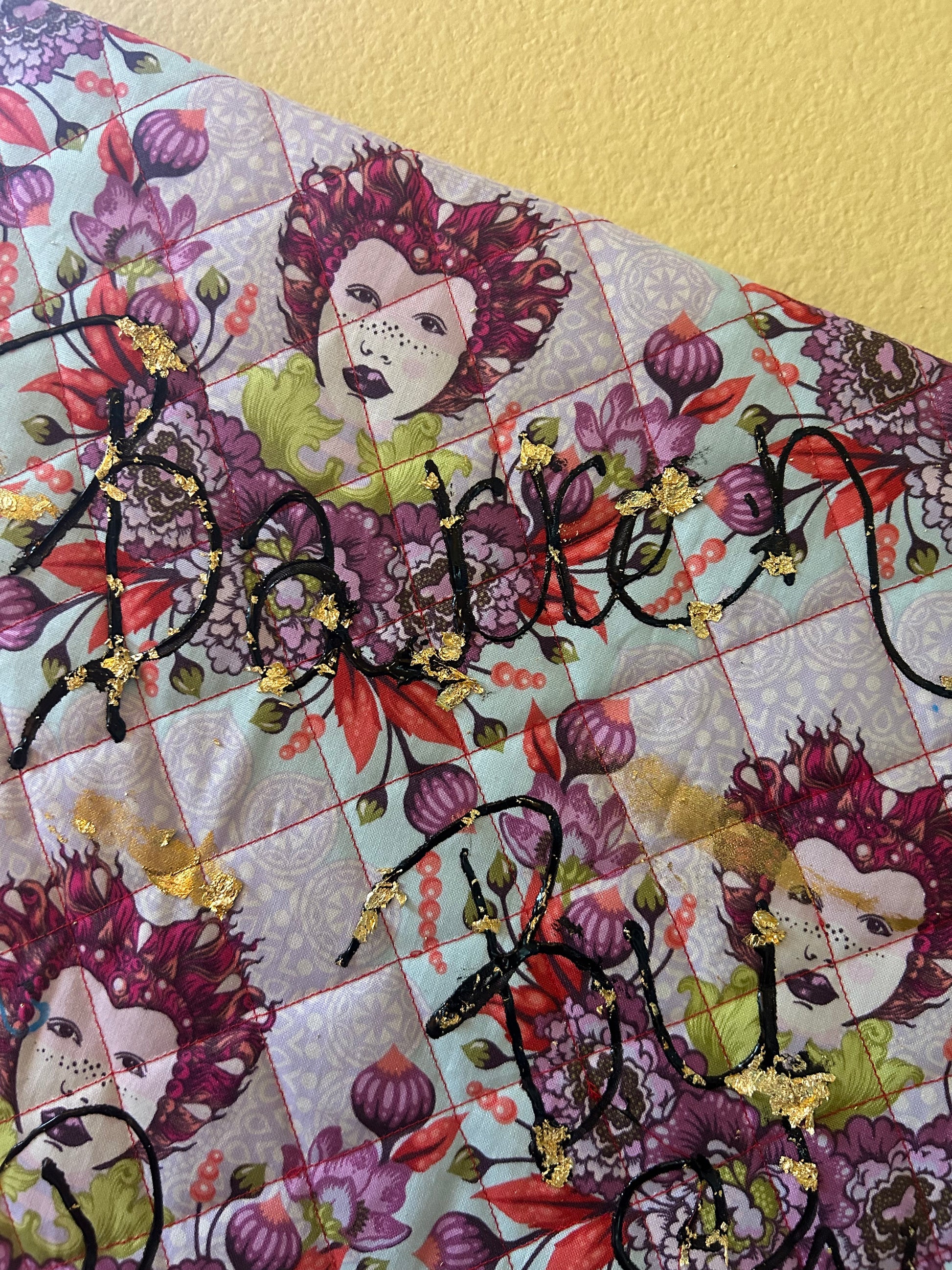 This one-of-a-kind mixed-media quilted wall hanging fuses opulent pattern with rebellious spirit. The richly colored cotton features surreal portraits of crowned queens surrounded by lush florals—an unexpected backdrop for the hand-painted declaration “Barren by Revolt.”