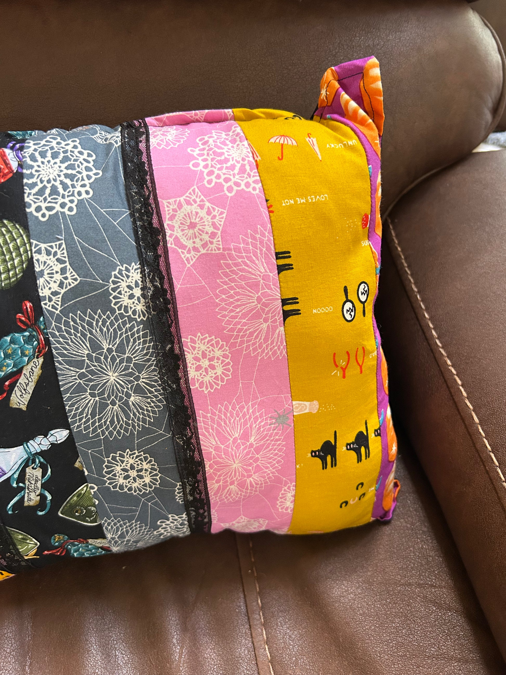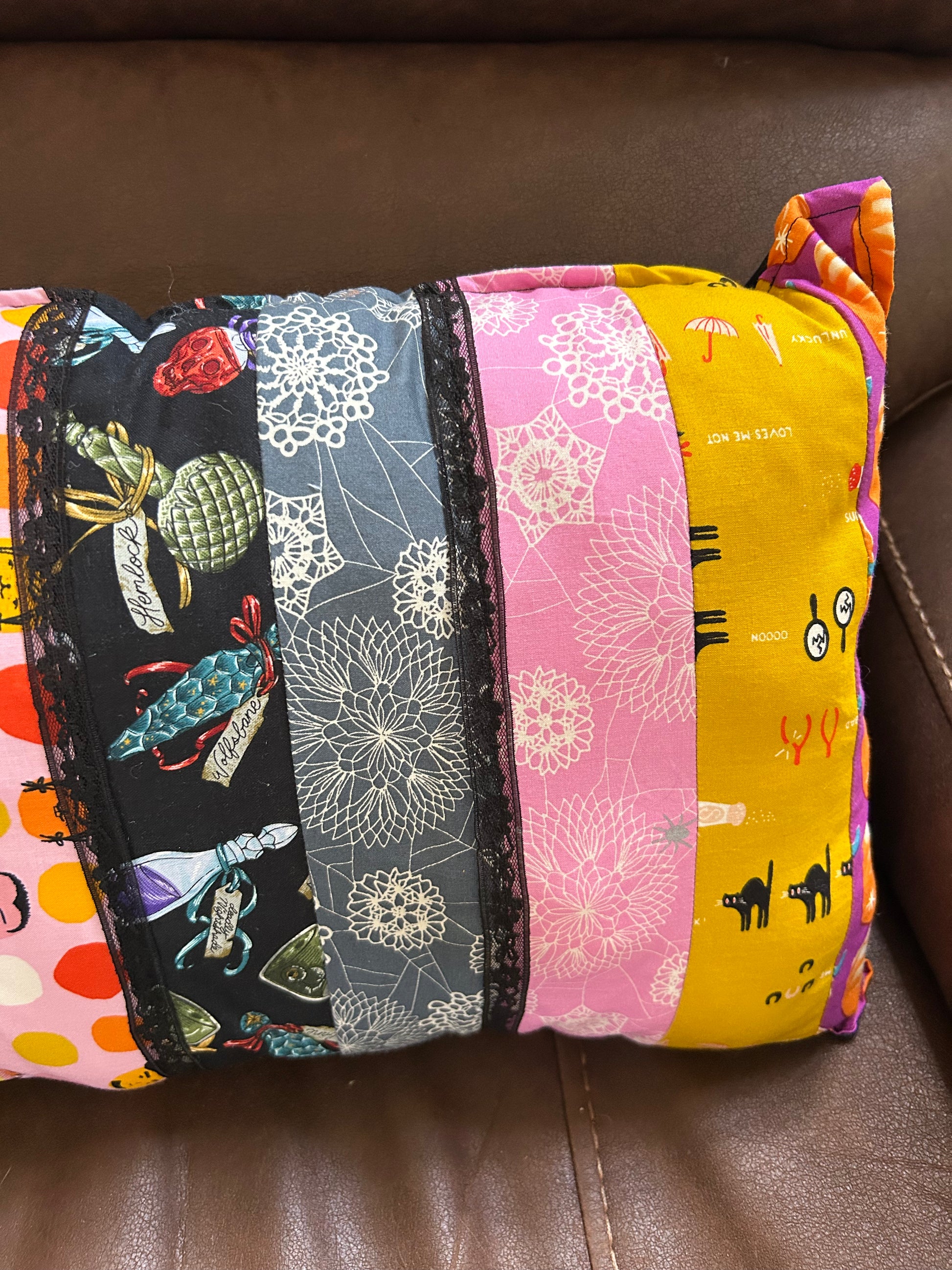 Brighten up your space with this one-of-a-kind handmade lumbar pillow. Bursting with personality, this piece combines an eclectic mix of vibrant fabrics—whimsical Halloween prints, bold polka dots, retro-inspired motifs, and delicate florals—stitched together in playful vertical panels.