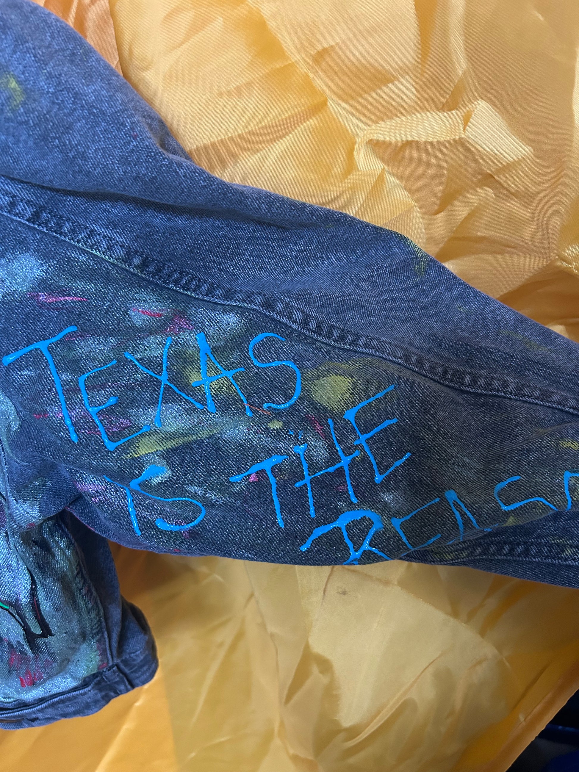 - Materials: Denim, acrylic textile paint, fabric medium, permanent markers