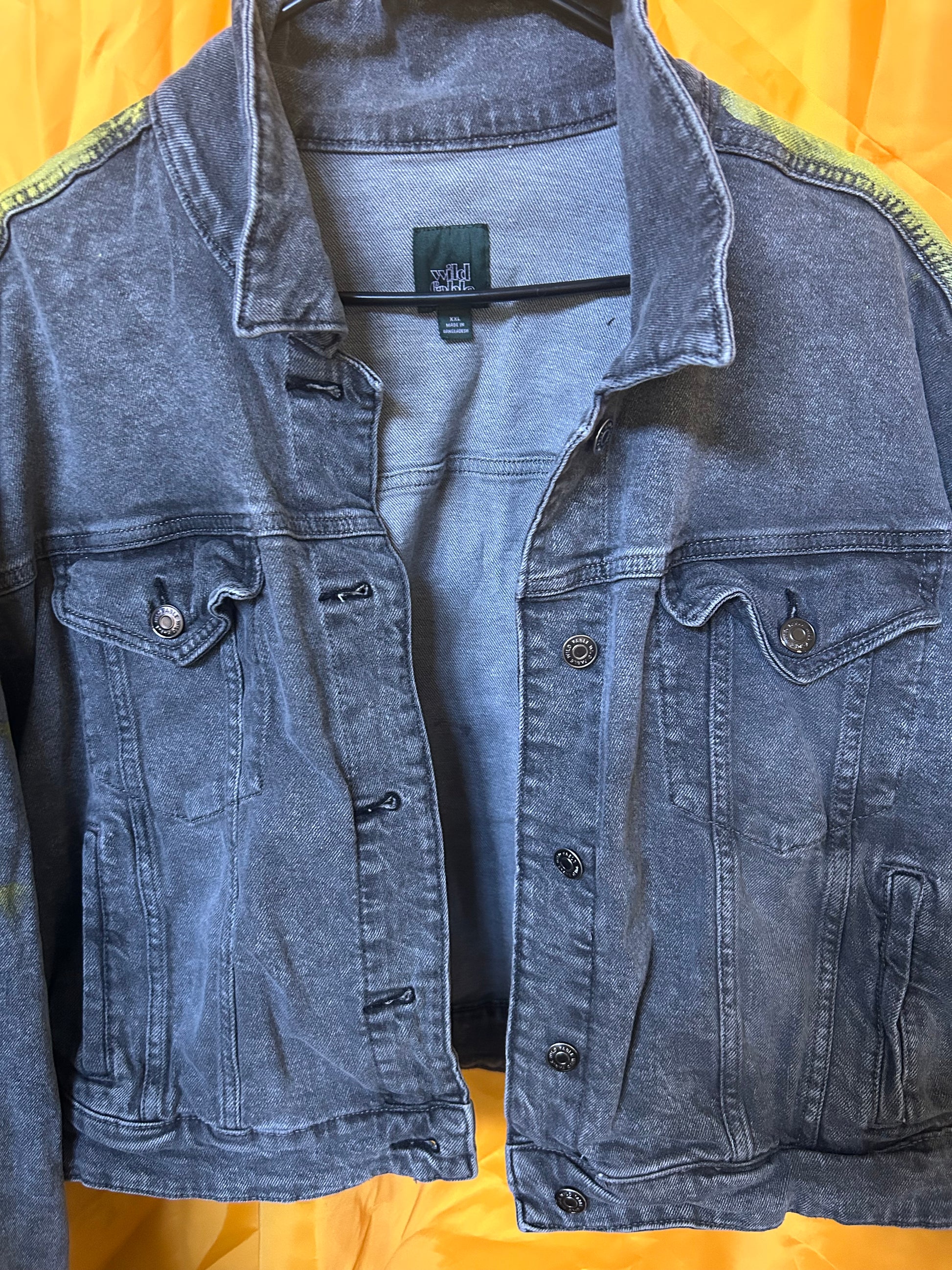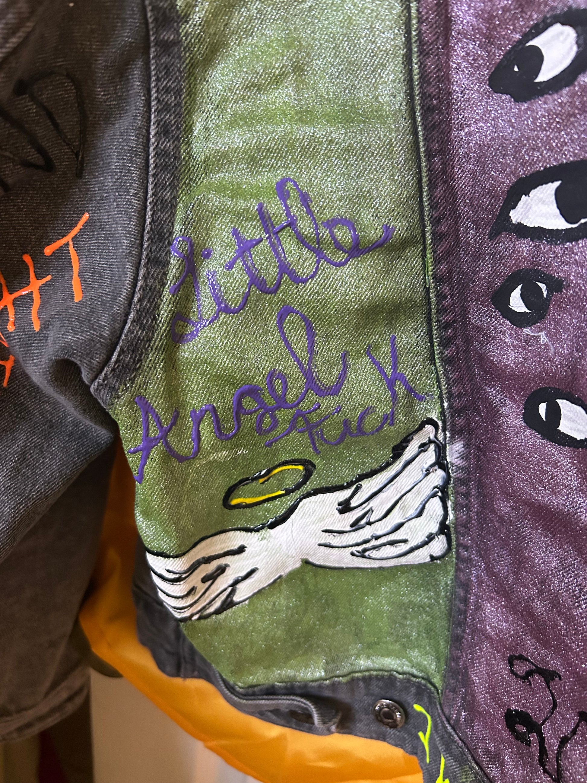 The front keeps it classic with a distressed wash, while the sleeves and panels are layered with metallic paints, vivid hand-lettered text, and surreal illustrations, including angel wings and graffiti-style script.