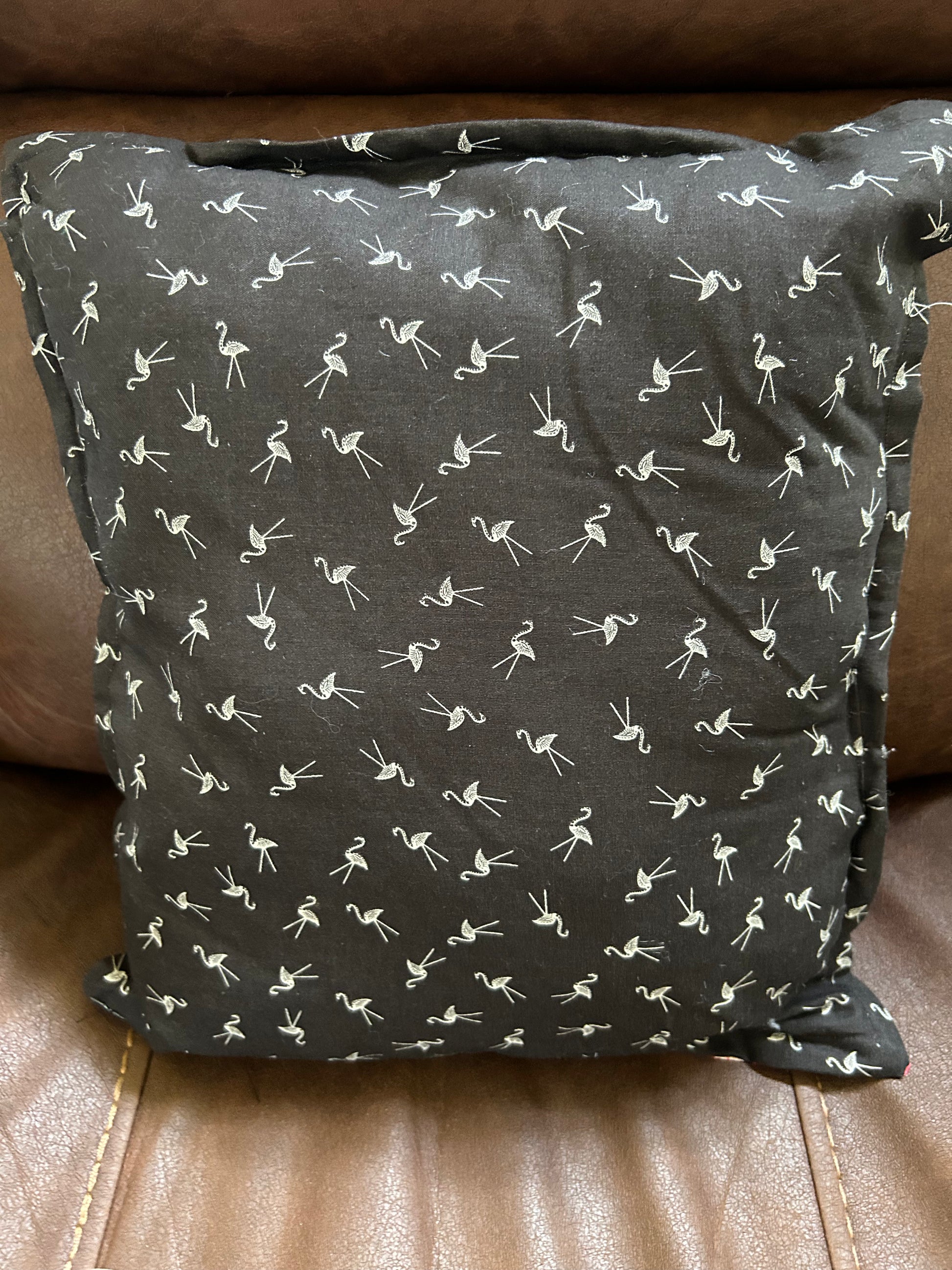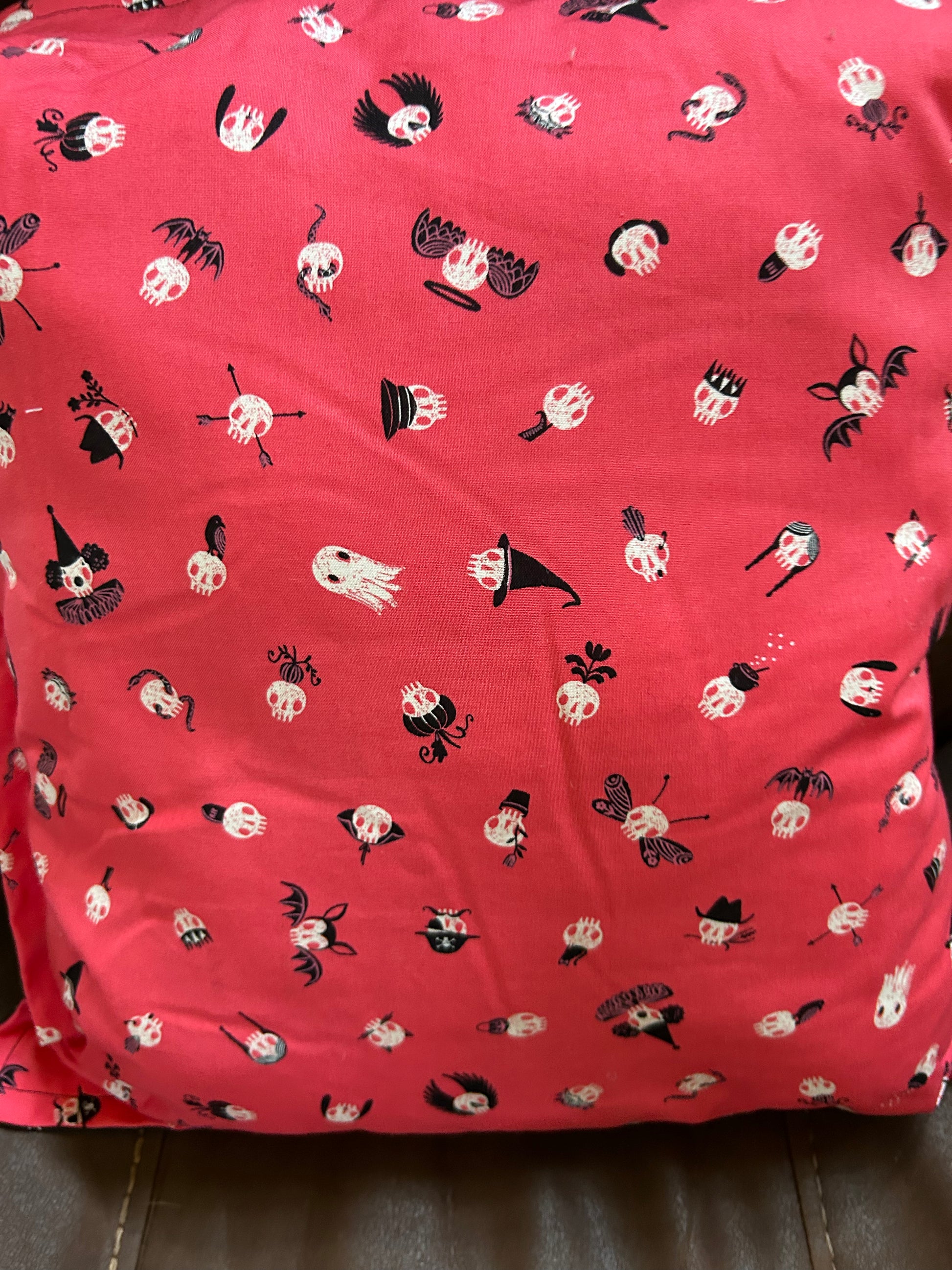 - Backs feature coordinating fabrics—choose from black flamingo print or bright pink skulls with Halloween details